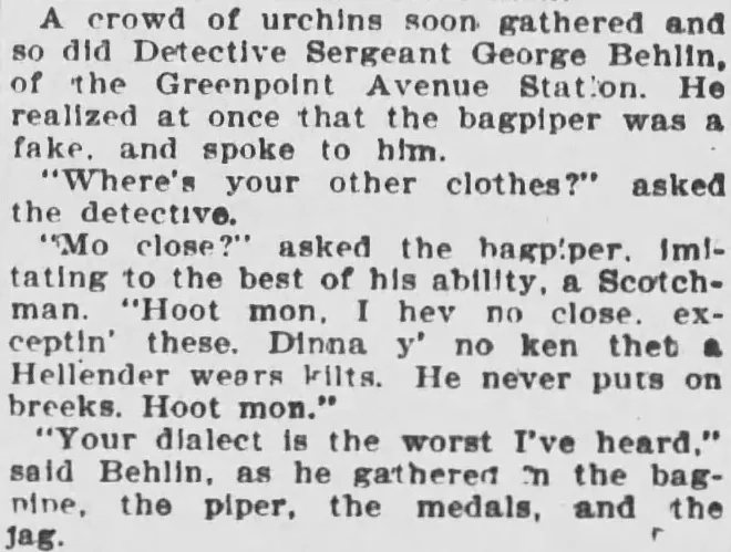 A crowd of urchins soon, gathered and so did Detective Sergeant George Behlin, of the Greenpoint Avenue Station. He realized at once that the bagpiper was a fake, and spoke to him.